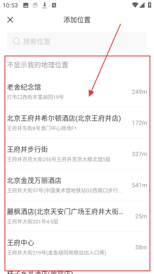 4、进入添加位置页面后,可选择具体位置,如【老舍纪念馆】等,完成位置添加啦。