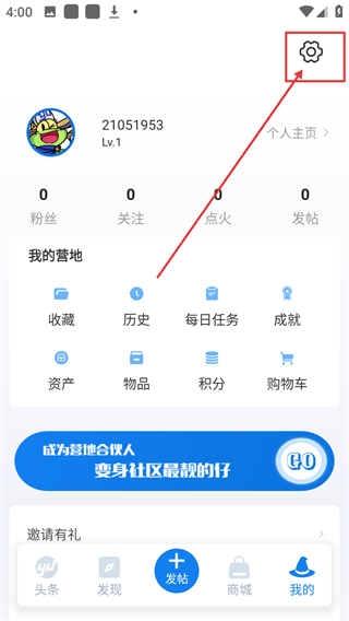 2、进入个人中心后,点击右上角的【设置】图标,即可进入设置页面,查看并调整账号配置选项哦。