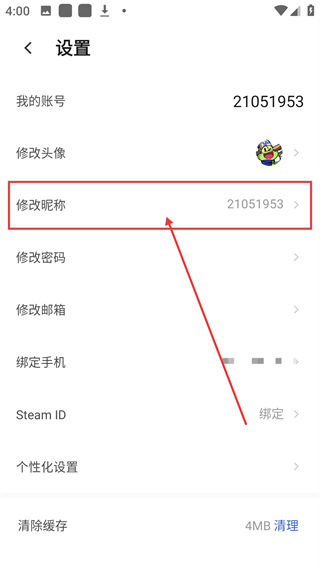 3、在设置页面中,点击【修改昵称】选项,可进入昵称修改界面,准备更换账号昵称啦。