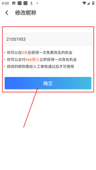 4、进入修改昵称页面,确认改名规则后,点击【确定】按钮,即可提交昵称修改的申请,等待审核通过呀。