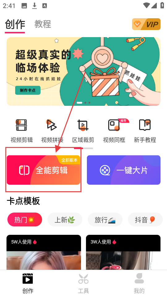 1、在创作页面,看到【全能剪辑】按钮,点击它,就能进入视频剪辑界面,开始剪辑视频啦。
