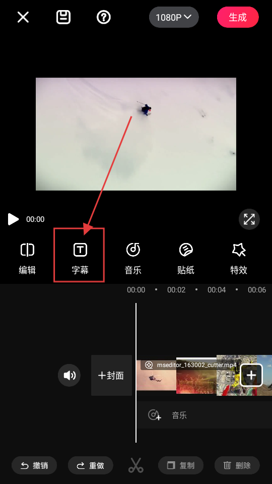 2、进入视频剪辑界面,看到【字幕】选项,点击它,就能进入字幕设置页面,给视频加字幕。