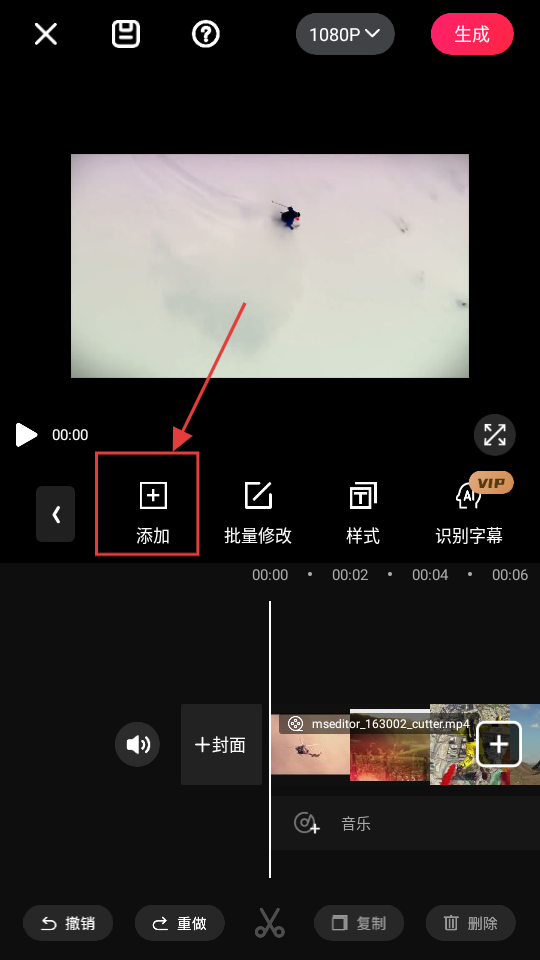 3、进入字幕设置页面,看到【添加】按钮,点击它,就能进入字幕输入页面,准备输入字幕内容。