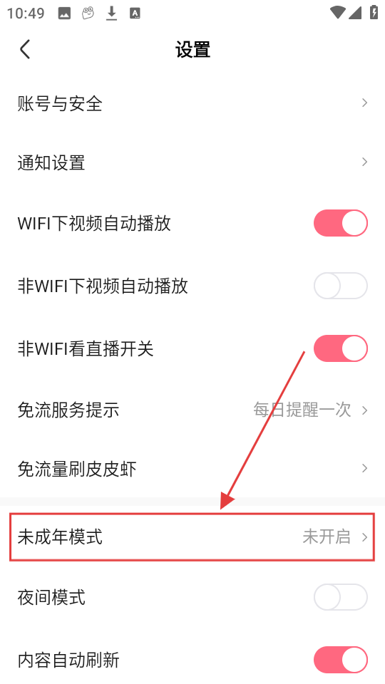 2、在设置页面,找到【未成年模式】选项并点击,进入未成年模式页面哦。