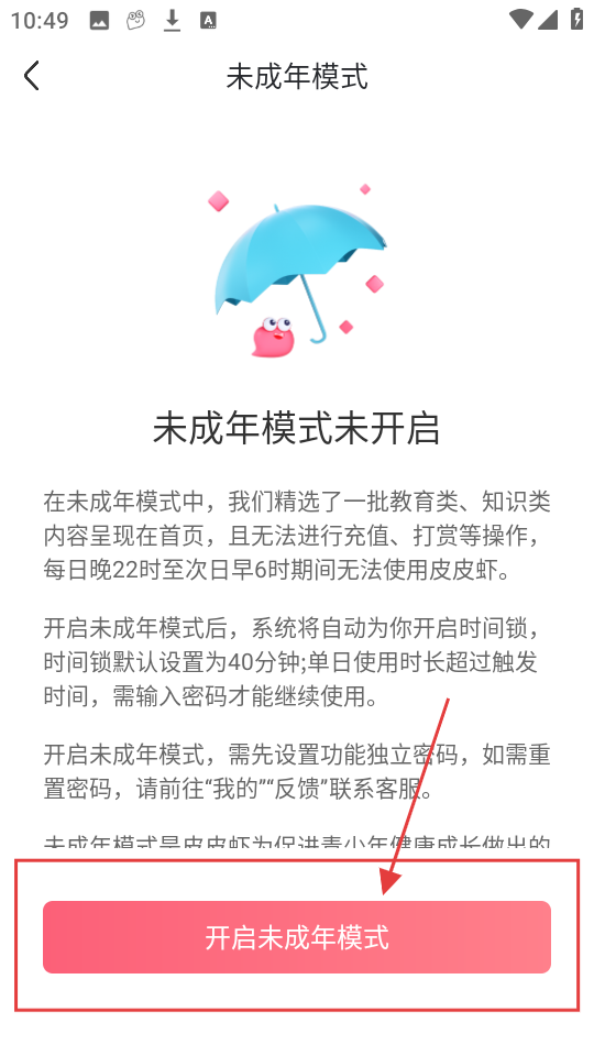 3、在未成年模式页面,点击【开启未成年模式】按钮,准备开启该模式呢。