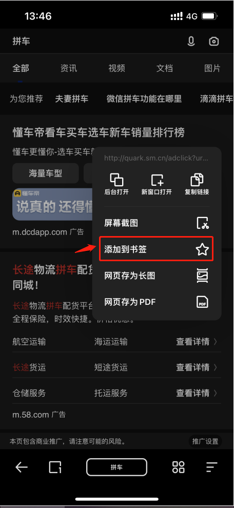 2、然后点击右下角横杠按钮,并登录自己的账号,选择“添加书签”选项,大家就能够成功的设置书签,以便日后查找了。