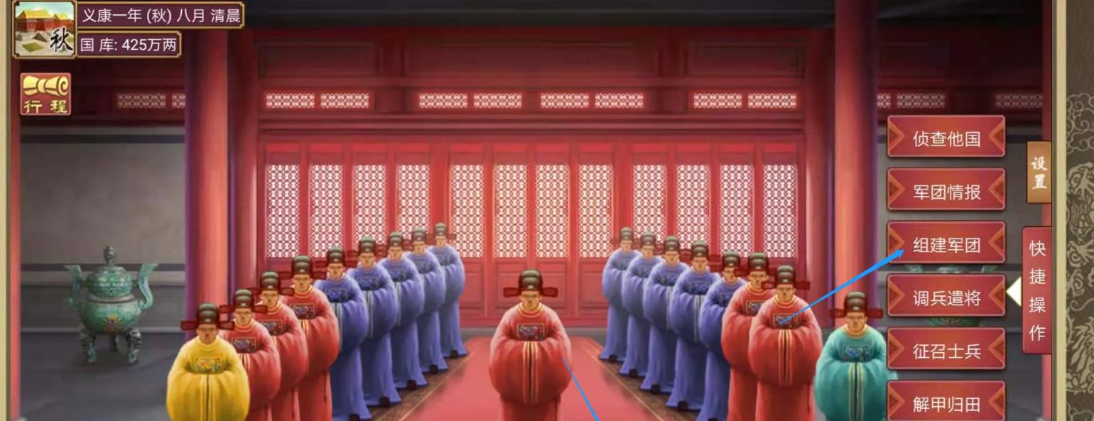 2·进入宣政殿后,点击兵部中的【组建军团】进入。