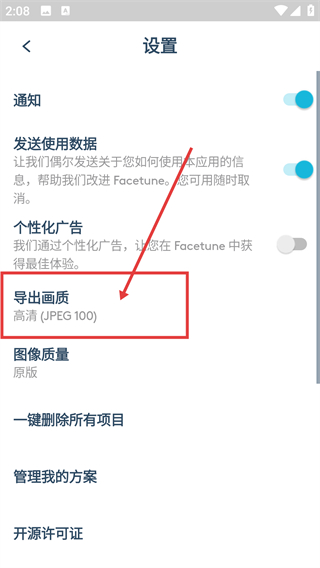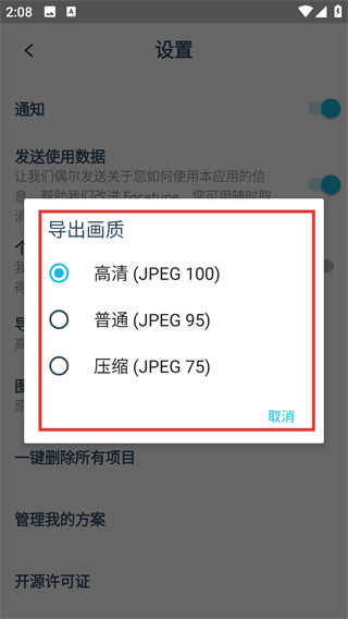3、进入设置页后找到【导出画质】选项,点它就能打开画质选择弹窗,挑选合适的导出画质啦。