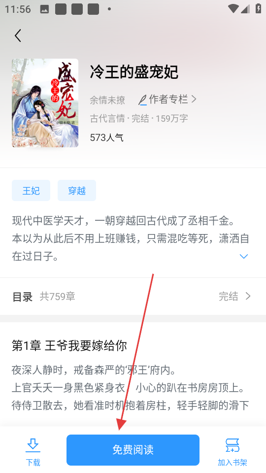 1、在书籍详情页,点击【免费阅读】,可进入阅读页面,开始阅读书籍内容啦。