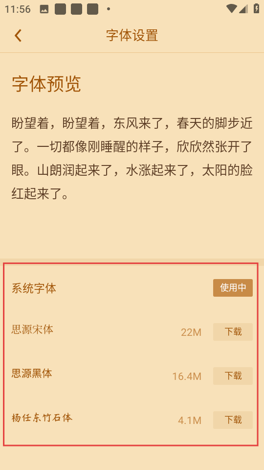 4、在字体设置页面,可选择思源宋体、思源黑体等字体,下载后使用新字体阅读啦。
