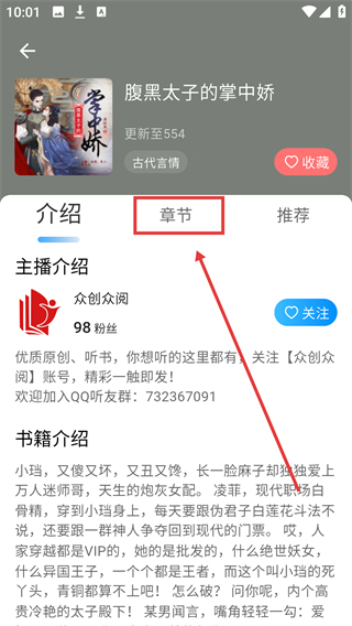 3、在书籍详情页,点击【章节】选项卡,可切换到章节列表界面,准备选择具体章节收听啦。