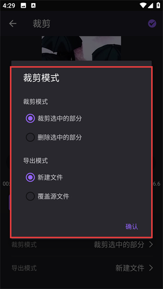 3、在裁剪模式弹窗里选好【裁剪选中的部分】和【新建文件】,点击确认就能执行裁剪啦。