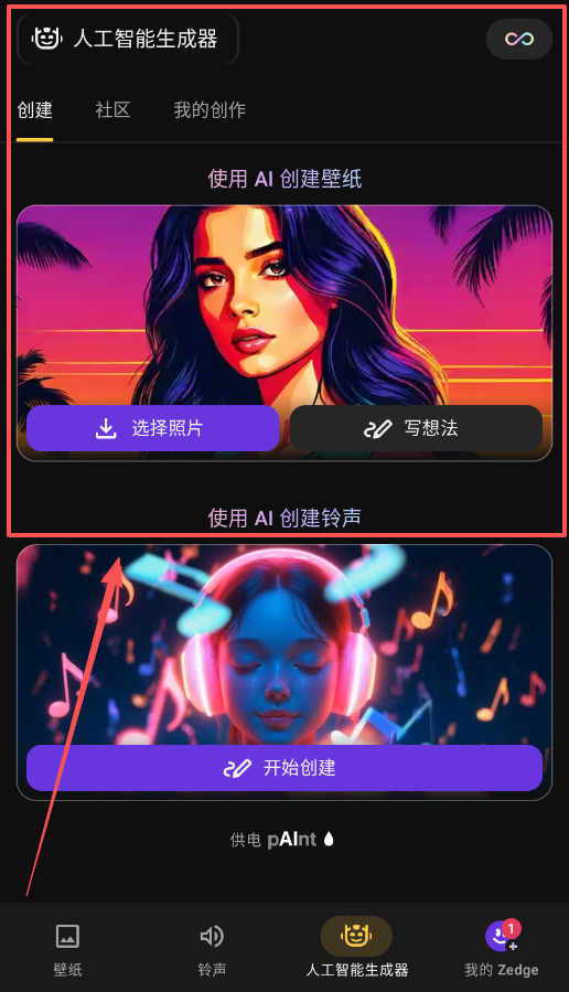 3、人工智能生成器让你创造独一无二的内容,进入该页面后,无论是壁纸还是铃声创作,都不妨多尝试几种描述或素材组合。