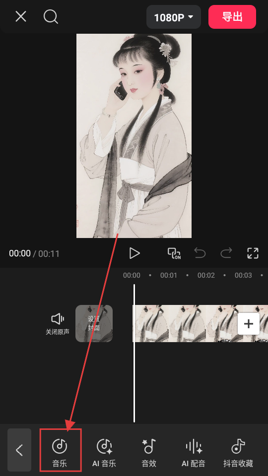 1、打开剪映,进入视频编辑界面后,点击【音乐】选项,进入音乐设置界面,准备提取视频音乐啦。
