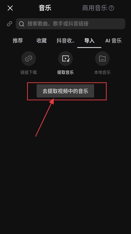 2、在音乐设置界面,切换到【导入】标签页,找到【提取音乐】功能,点击它,进入提取音乐流程哦。