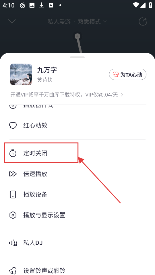 3、打开更多操作选项后,找到【定时关闭】选项并点击,这样就能设置定时关闭音乐啦。