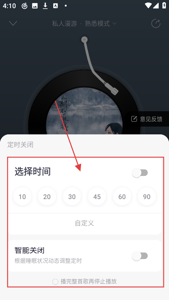 4、进入定时关闭设置页面,选择合适的时间,像10分钟、20分钟等,就能让音乐按时关闭啦。