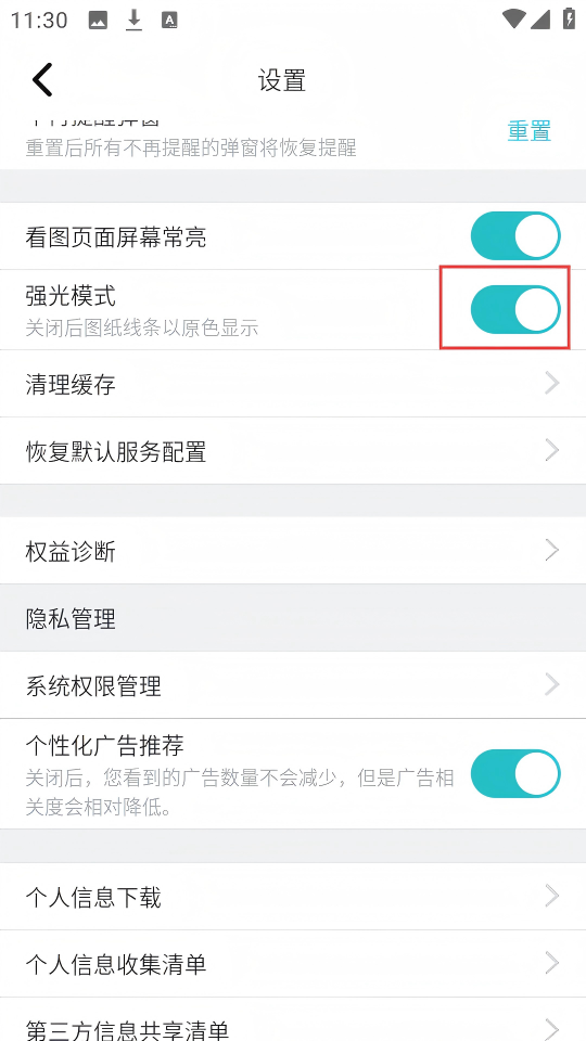 3、进入设置,找到【强光模式】选项,它能让图纸线条以黑白颜色显示,根据需求选择开启或关闭啦。