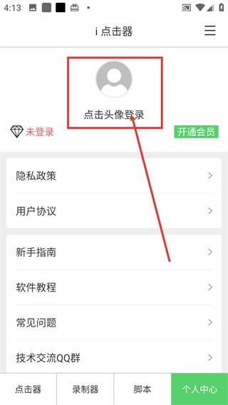 1、在【i点击器】主界面,点击底部【个人中心】按钮,可进入个人相关页面哦。