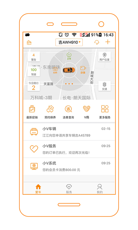 V服app是一款生活服务应用,是针对4S店、车主、司机提供的旗下服务平台。在V服爱车app中你可观看爱车讲堂,查阅周边服务应用和天气,以及在线与车友沟通等。