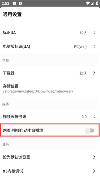 4、在通用设置页找到【网页-视频自动小窗播放】开关,点击就能开启该功能,让视频自动小窗播放啦。