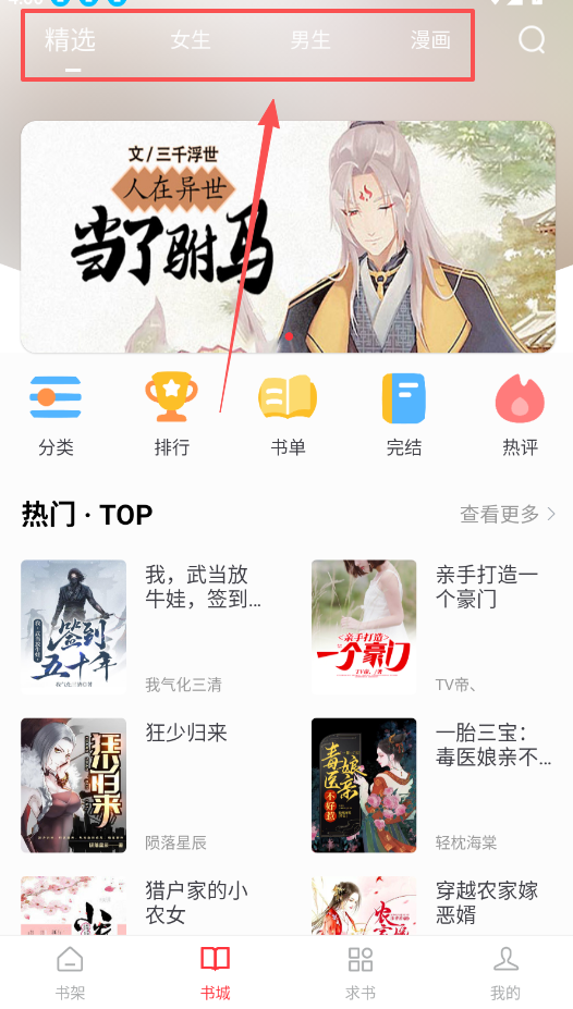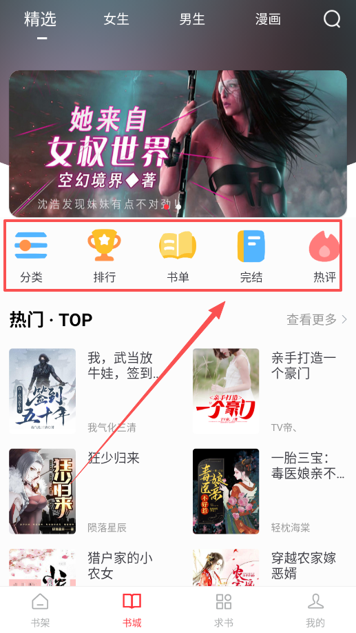 1、使用这款软件,你可以先从“书城”顶部的“男生”或“女生”频道进入。