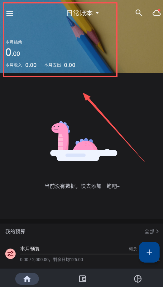 2、进入日常账本页面后,系统会清晰展示本月结余、收入支出等核心数据,初次使用可以看到预算管理功能。