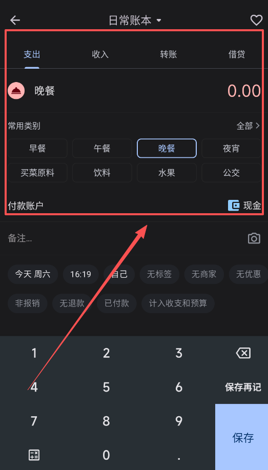 3、记账时先选择支出类型,比如晚餐、早餐等常用类别,支持连续记账功能非常方便。