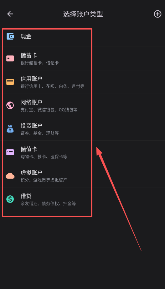4、想要添加新账户时,提供了现金、储蓄卡、信用账户等七大类选择,根据实际需求选择对应类型。
