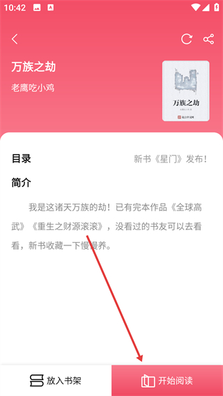 1、在【万族之劫】详情页点击【开始阅读】按钮,就能进入小说阅读界面,开启阅读之旅啦。