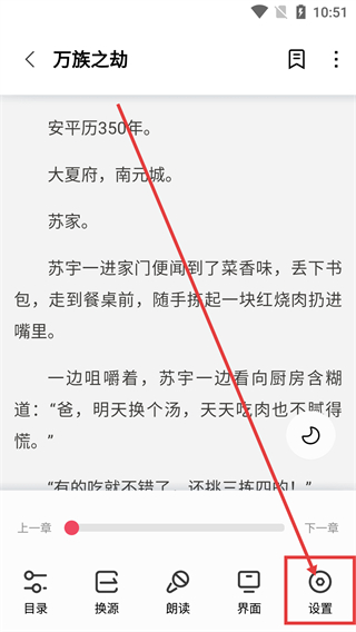 2、进入阅读界面后,点击底部【设置】选项,就能打开阅读设置菜单,调整阅读相关的参数哦。