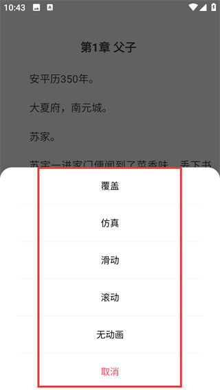 4、在翻页模式选择界面,可挑选【覆盖】【仿真】等模式,选好后就能按新方式翻页阅读啦。