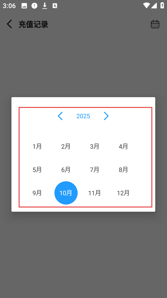 3、在充值记录页面,点击右上角日历图标,弹出日期选择面板,可选择要查询的月份啦。