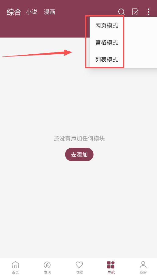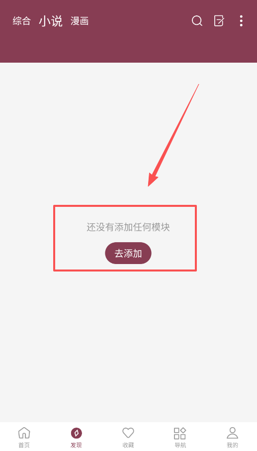 1、打开App,优先处理首页的“去添加”提示,从提供的模块库里添加常看的小说或漫画分类,你还能通过顶部标签随时切换内容类型。