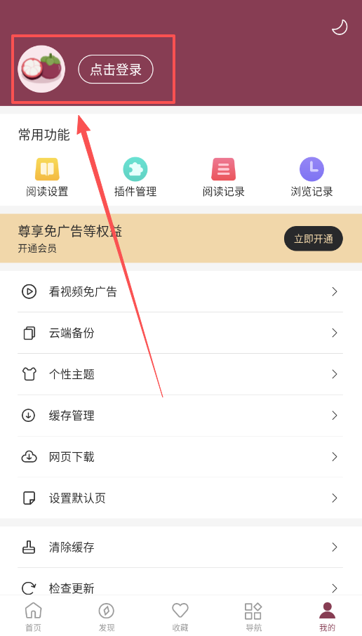 3、点开“我的”完成登录,常用功能如阅读记录、插件管理都在这里,会员权益包括免广告、云端备份等,定期清理一下缓存顿。