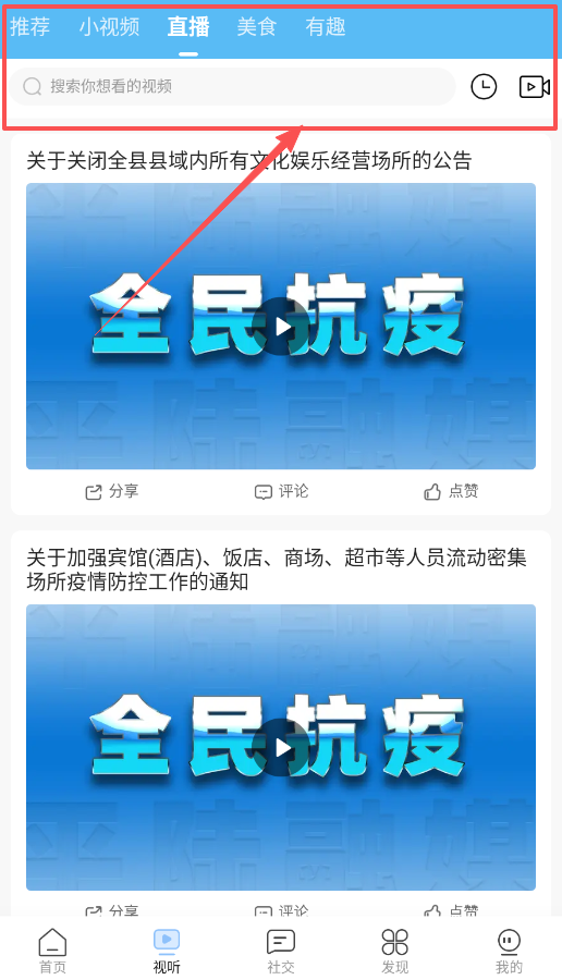 2、想看视频或直播内容,你可以切换到“视听”或“社交”板块,那里有“电视新闻、电视栏目、直播”等选项。