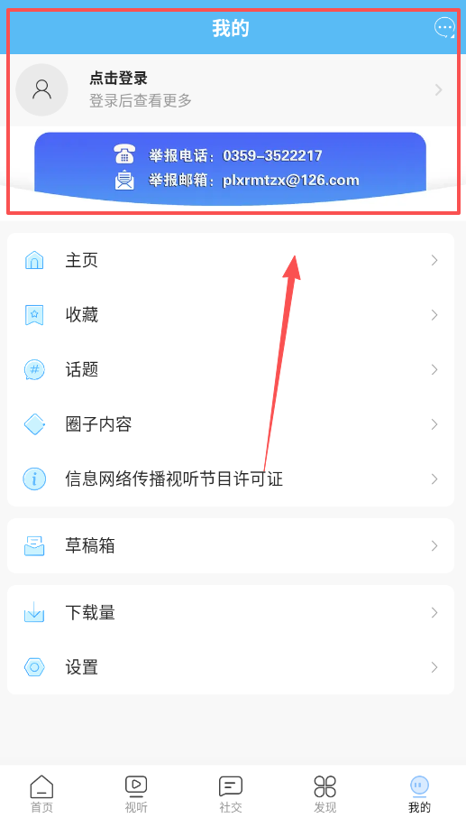 3、在“我的”页面,需要先点击登录以解锁收藏、圈子等个人功能,页面底部提供了举报电话和邮箱,这里还能找到草稿箱和软件设置。