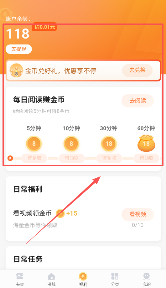 3、然后呢,想赚取金币的话,可以多多关注“福利”板块,里面设有“每日阅读赚金币”任务,增加你的账户余额呢。