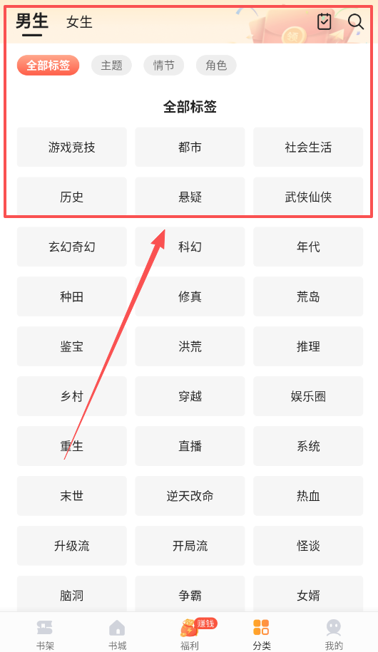 2、接着呢,你可以通过丰富的标签来精准找书,标签类型非常多,利用好这些分类能帮你快速找到合口味的小说。