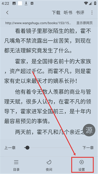 3、在阅读界面点击底部【设置】按钮,就能打开阅读配置面板,调整字号、背景等阅读参数啦。
