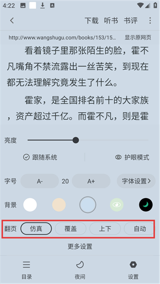 4、在设置面板里,可选择【仿真】【覆盖】等翻页方式,自定义阅读时的翻页体验咯。