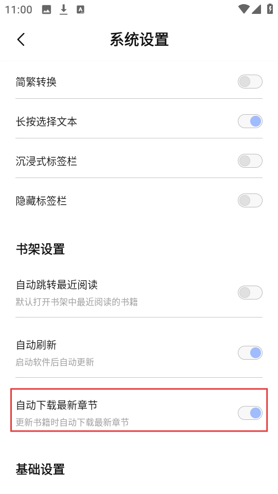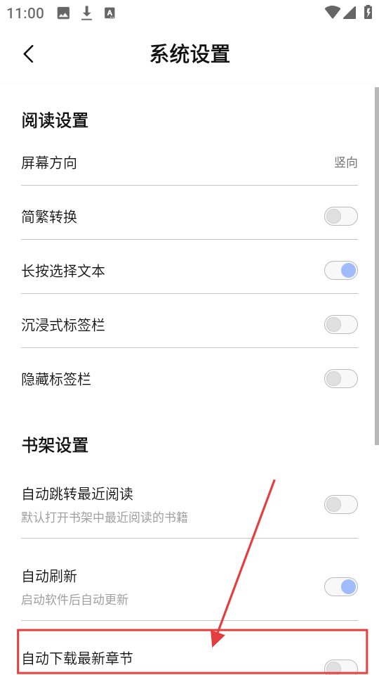 3、在【系统设置】里找到【自动下载最新章节】,开启它就能自动下载章节啦,超方便哦。
