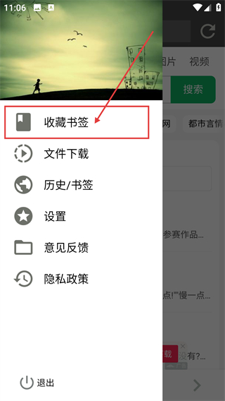 2、展开功能列表后,点【收藏书签】选项能进入网址收藏页,可把当前页面添加为书签哦。