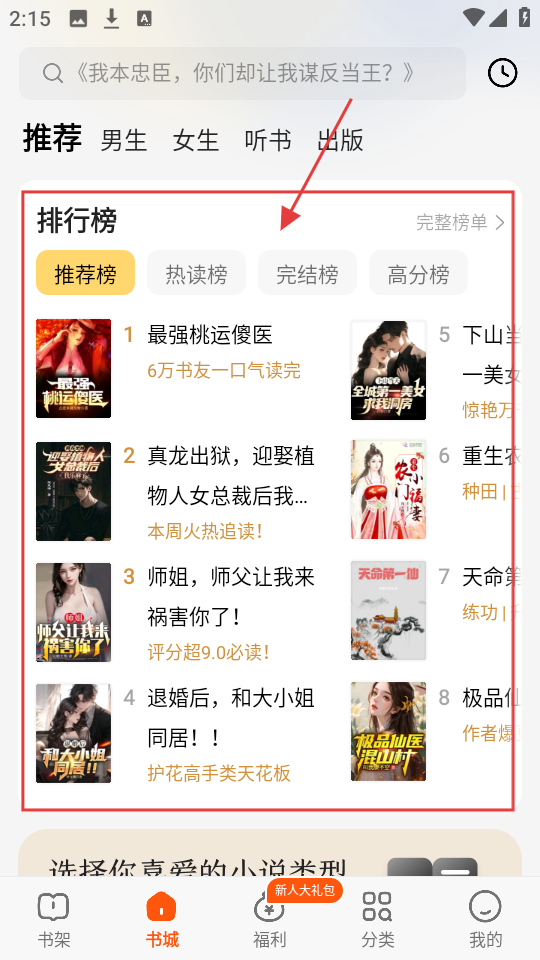 1、在书城页面,可浏览排行榜中的推荐榜、热读榜等,找到感兴趣的书籍啦。