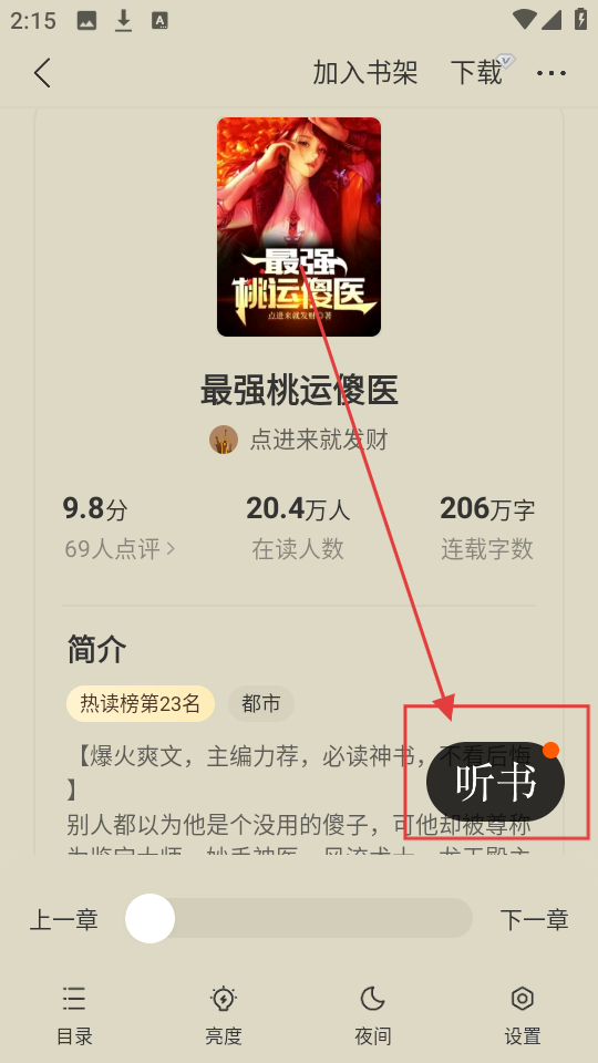 2、点击感兴趣的书籍进入详情页后,点击【听书】,可进入听书页面哦。