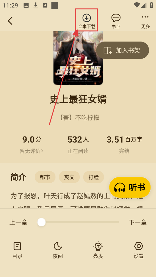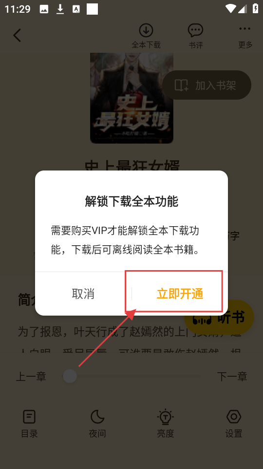2、小说详情页点【全本下载】,触发下载提示,可开通VIP下载全本啦。