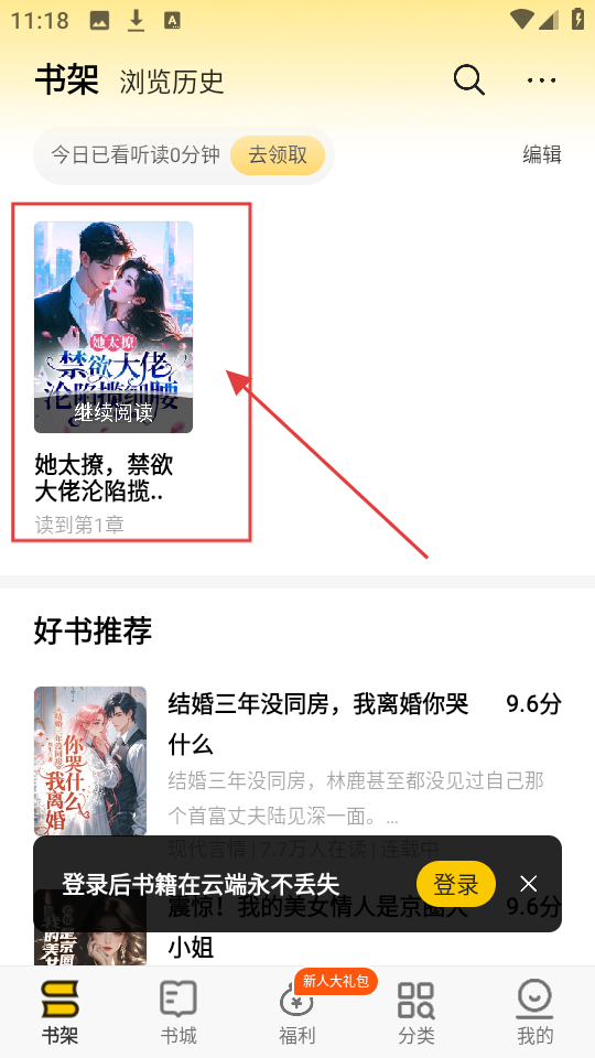 1、在书架里看到想看的小说比如【她太撩,禁欲大佬沦陷揽细腰】,就点击它进入阅读页吧。