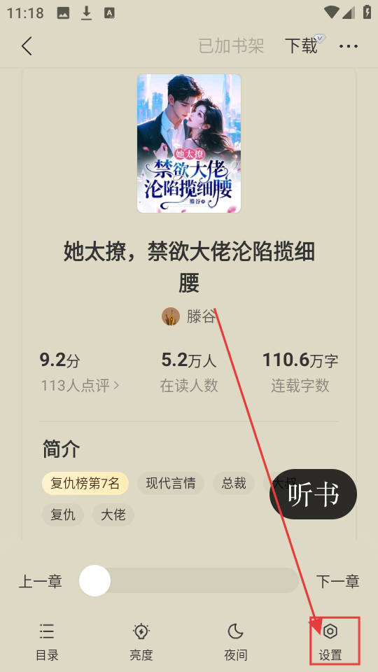 2、进入阅读页后,点击【设置】按钮,就能调整阅读相关的设置啦。
