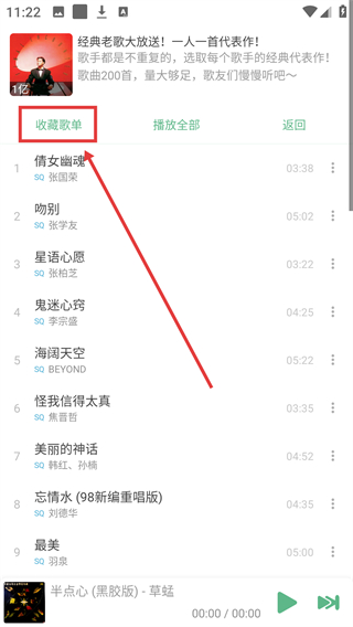 4、在我的列表里找到刚收藏的【经典老歌大放送!一人一首代表作!】歌单,点击即可查看啦。
