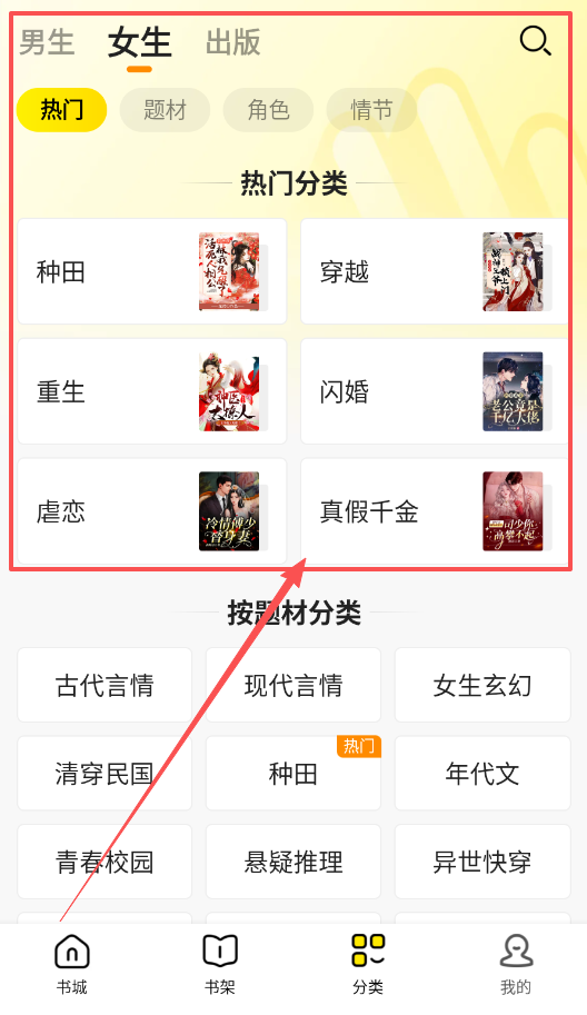 3、利用“分类”页的“热门分类”和“按题材分类”功能,能极大提升找书效率,快速锁定如重生、闪婚等特定情节的小说。